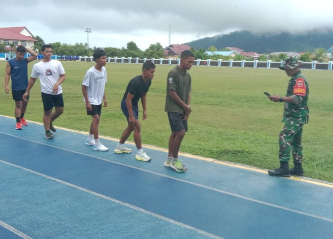 Tapteng — Babinsa Koramil 03/Pandan Serda Berlin Simatupang memberikan latihan fisik kepada pemuda pendaftar calon prajurit TNI AD di Lapangan GOR Pandan ,Kel Pandan Wangi ,Kec Pandan ,Kab Tapteng,Jumat (16/05/2023)