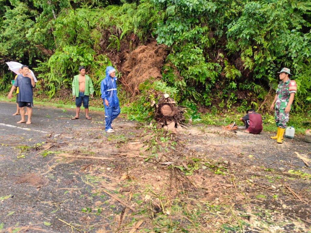 TAPTENG – Babinsa Koramil 04/Pinangsori jajaran Kodim 0211/Tapanuli Tengah, Senin 14 Juli 2025. Kopka M Purba Membantu warga bergotong-royong membersihkan jalan akibat pohon tumbang di Desa Aek Horsik Kec. Badiri Kab. Tapanuli Tengah.