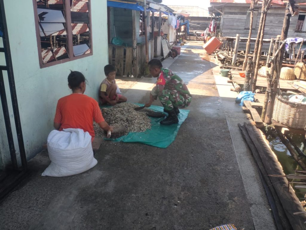 Babinsa Serda Mark Anderson Mangamis melaksanakan komunikasi sosial dengan membantu warga binaan yang mempunyai usaha ikan asin,di Kelurahan simare-mare Kecamatan Sibolga Utara Kota Sibolga.