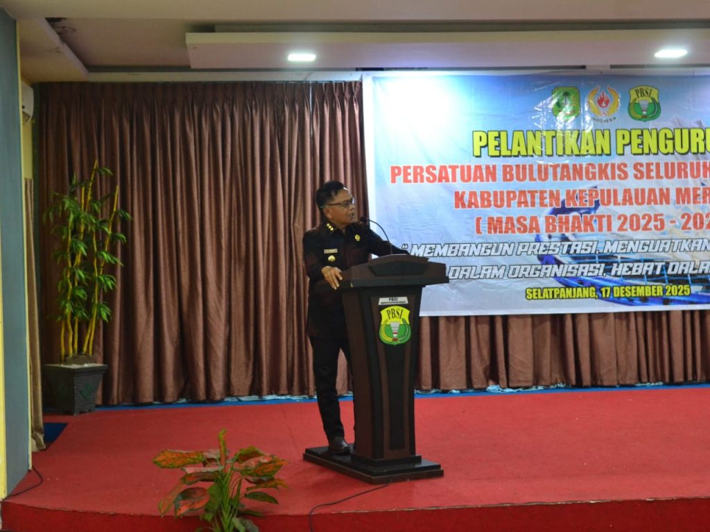 sidik24jam. MERANTI — Bupati Kepulauan Meranti, AKBP (Purn) H. Asmar, menghadiri secara langsung pelantikan Pengurus Kabupaten Persatuan Bulutangkis Seluruh Indonesia (PBSI) Kepulauan Meranti periode 2025–2029 yang digelar di Ballroom Afifa Futsal Lantai 2, Jalan Banglas, Selatpanjang, Rabu (17/12/2025).