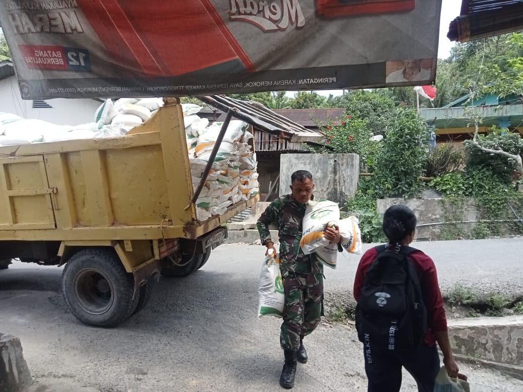 TAPTENG_Guna mendukung terwujudnya ketahanan pangan di wilayah,Koramil 02/Sorkam.Kodim 0211/Tapteng.Serka Afdolsyah Simbolon. Melaksanakan pendampingan penyaluran bantuan beras dari bulok, yang bertempat di Desa.Sipakpahi.Kc Pasaribu Tobing..Kb.Tapanuli Tengah.