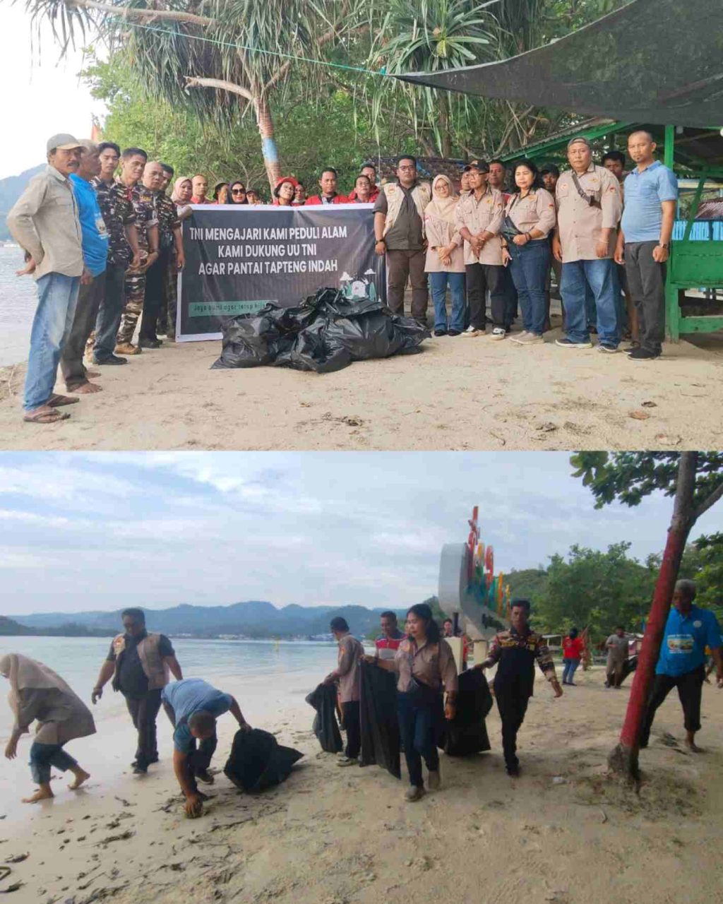 “Pantauan awak media, dalam kegiatan tersebut Rombongan OKP yang melakukan Aksi bersih, juga memasang spanduk yang bertuliskan : “TNI Mengajari Kami Peduli Alam, Kami Dukung UU TNI agar pantai Tapteng indah, Alam Pantai Bersih Indonesia Lestari UU TNI direvisi kami setuju sekali”.