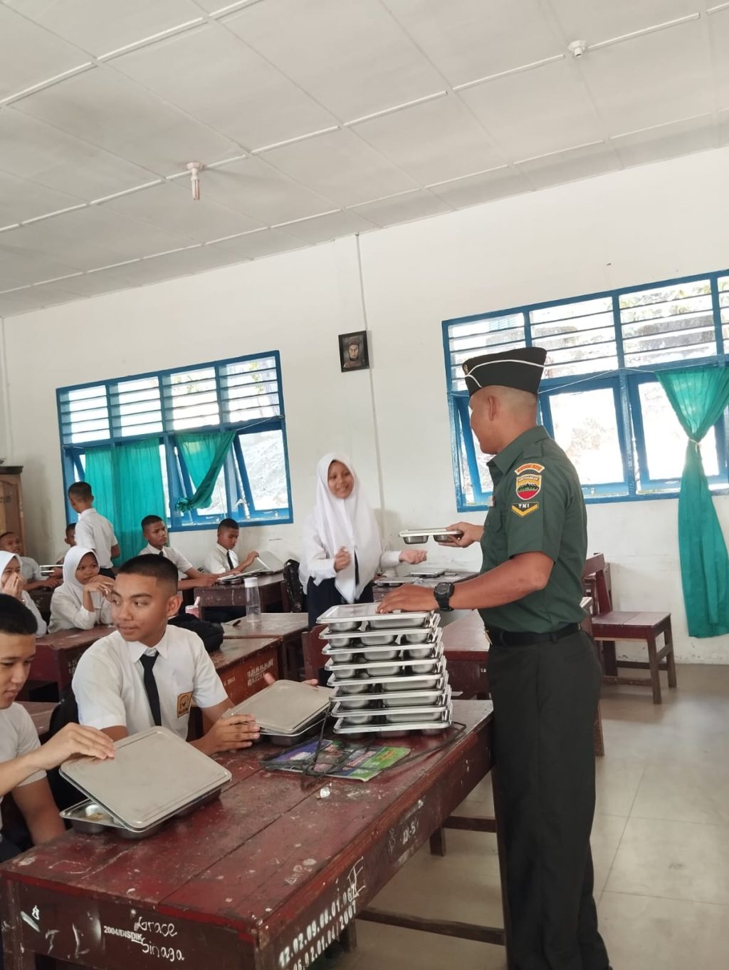 Tapteng -Babinsa Koramil 03/Pandan Kodim 0211/TT mendukung dalam Program Makan bergizi untuk Anak Sekolah seperti yang dilakukan Serda Al Amin Pasaribu dalam pendampingan makan bergizi di SMP N 1 Pandan Kelurahan Pandan Wangi Kecamatan Pandan Kabupaten Tapanuli Tengah Senin, (21/04/2025)