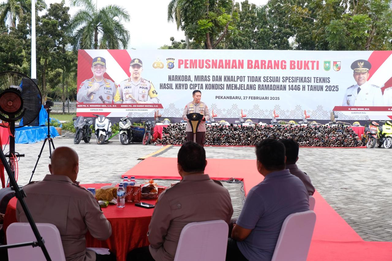 Sidik24jam. Pekanbaru – Jelang bulan suci Ramadan, Polda Riau memusnahkan barang bukti hasil penindakan kegiatan rutin yang ditingkatkan (KRYD) selama satu bulan penuh, Kamis (27/2/2025).