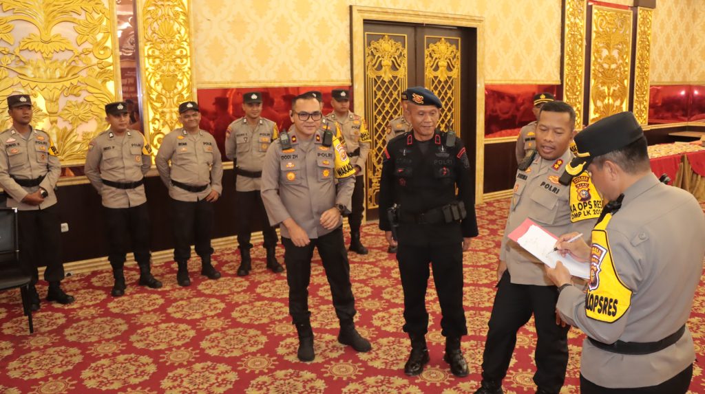 AKBP Kurnia Setyawan SH SIK menjelaskan peranan tugas kepada seluruh personil Polres Kepulauan Meranti sesuai Pembagian Floting Pengamanan Rapat Pleno KPU Tingkat Kabupaten Pilkada Serentak 2024 Kabupaten Kepulauan Meranti.