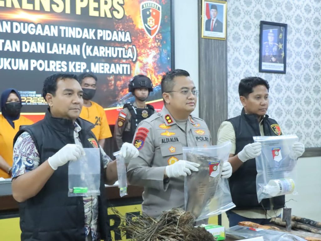 Polisi mengamankan sejumlah barang bukti dari lokasi, seperti dua buah parang, satu mancis, kayu bekas terbakar, dan beberapa bibit tanaman. Su ditangkap dan diperiksa pada 31 Juli 2025 di Polres Kepulauan Meranti.