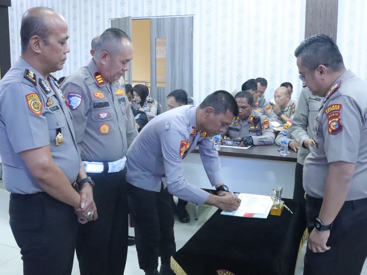 Selain itu, Kegiatan tersebut dipimpin langsung oleh Kapolres Kepulauan Meranti, AKBP Aldi Alfa Faroqi, S.H., S.I.K., M.H., dan dihadiri Wakapolres Kompol Detis Mayer Silitonga, S.H., para pejabat utama, para Kapolsek jajaran, perwira, serta seluruh personel Polres Kepulauan Meranti.