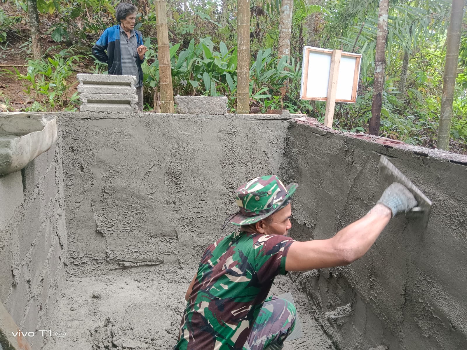 Dengan memanfaatkan bahan material lokal serta struktur penyangga dari bambu, anggota Satgas TMMD bekerja dengan penuh kehati-hatian dan ketelitian. Salah satu anggota Satgas terlihat sedang melakukan proses pelapisan dinding bak menggunakan adukan semen, sementara yang lain melakukan pengecekan kekuatan struktur dari atas tangga bambu. Semua pekerjaan dilakukan secara bergotong royong bersama warga desa, mencerminkan semangat kebersamaan dan kemanunggalan TNI dengan rakyat.