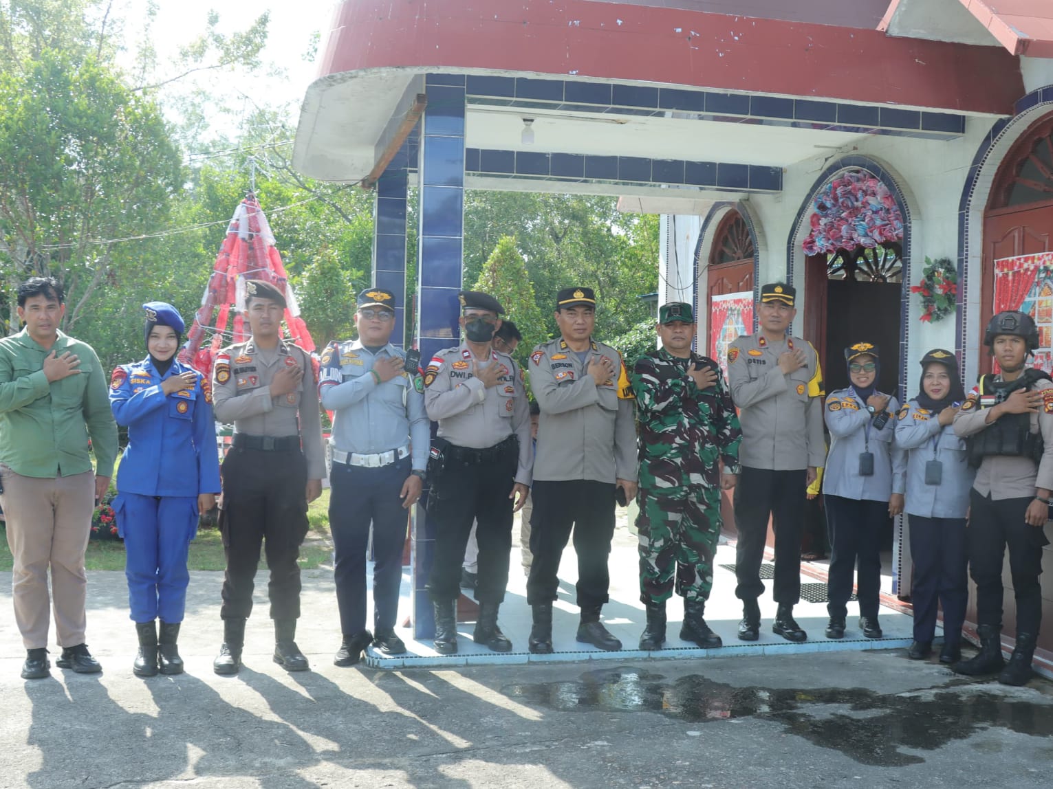 Wakapolres Kompol Detis Mayer Silitongga Mewakili Kapolres Meranti AKBP Aldi Alfa Faroqi bersama Danramil 02 Tebing Tinggi dan para Pejabat Utama Polres Kepulauan Meranti melaksanakan peninjauan langsung terhadap kesiapan personel, sarana prasarana pendukung, serta sistem pengamanan pada sejumlah lokasi gereja yang melaksanakan ibadah malam Natal.